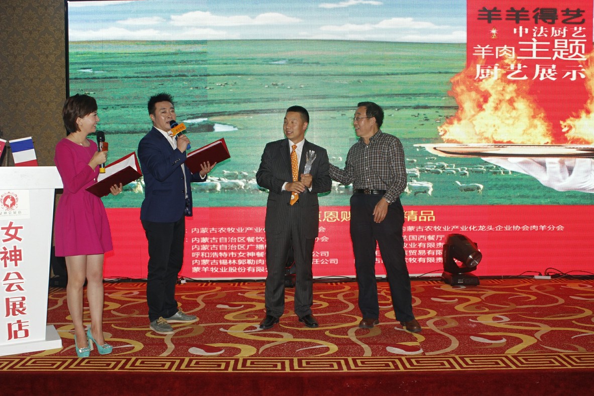 20131011晚上7點,羊羊得藝——中法廚藝比拼準時開始。出席此次廚藝比拼的領導有自治區(qū)原人大副主任、協(xié)會名譽會長雷·額爾德尼,自治區(qū)政府原副主席、協(xié)會名譽會長傅守正、自治區(qū)農牧業(yè)廳廳長、協(xié)會名譽會長郭健及協(xié)會各高級顧問、農牧業(yè)廳有關領導和協(xié)會會長、副會長、秘書長、副秘書長等。出席本次活動的還有農牧業(yè)廳副廳長翟、農牧科學院院長趙存發(fā)等特邀嘉賓評委以及各位專家評委和農牧業(yè)產業(yè)發(fā)展論壇邀請的特邀嘉賓等。