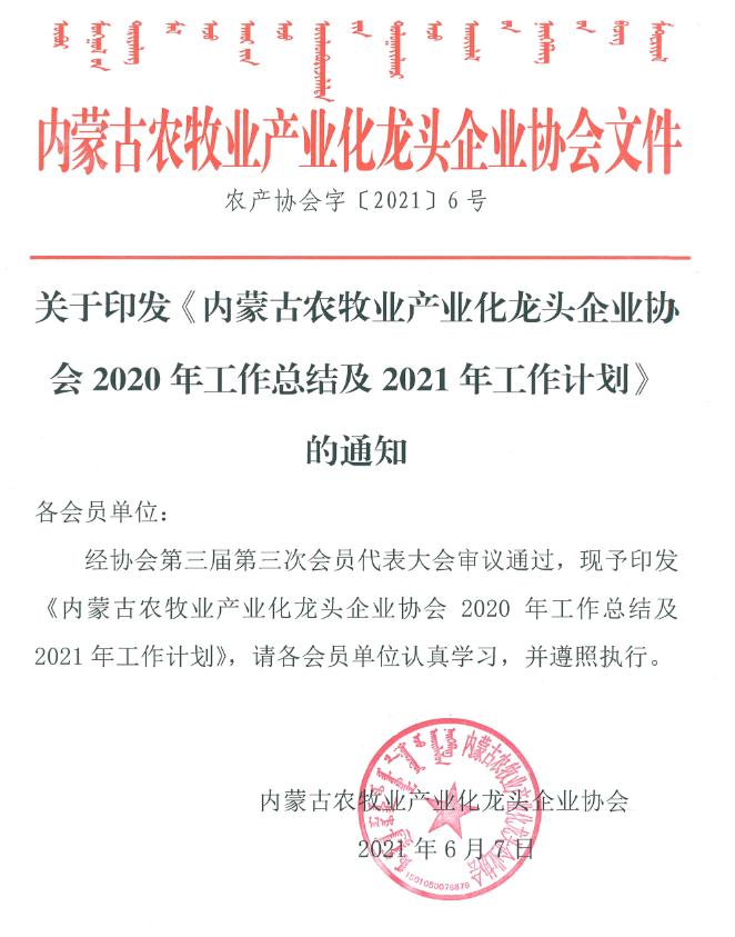 關(guān)于印發(fā)《內(nèi)蒙古農(nóng)牧業(yè)產(chǎn)業(yè)化龍頭企業(yè)協(xié)會(huì)2020年工作總結(jié)及2021年工作計(jì)劃》的通知