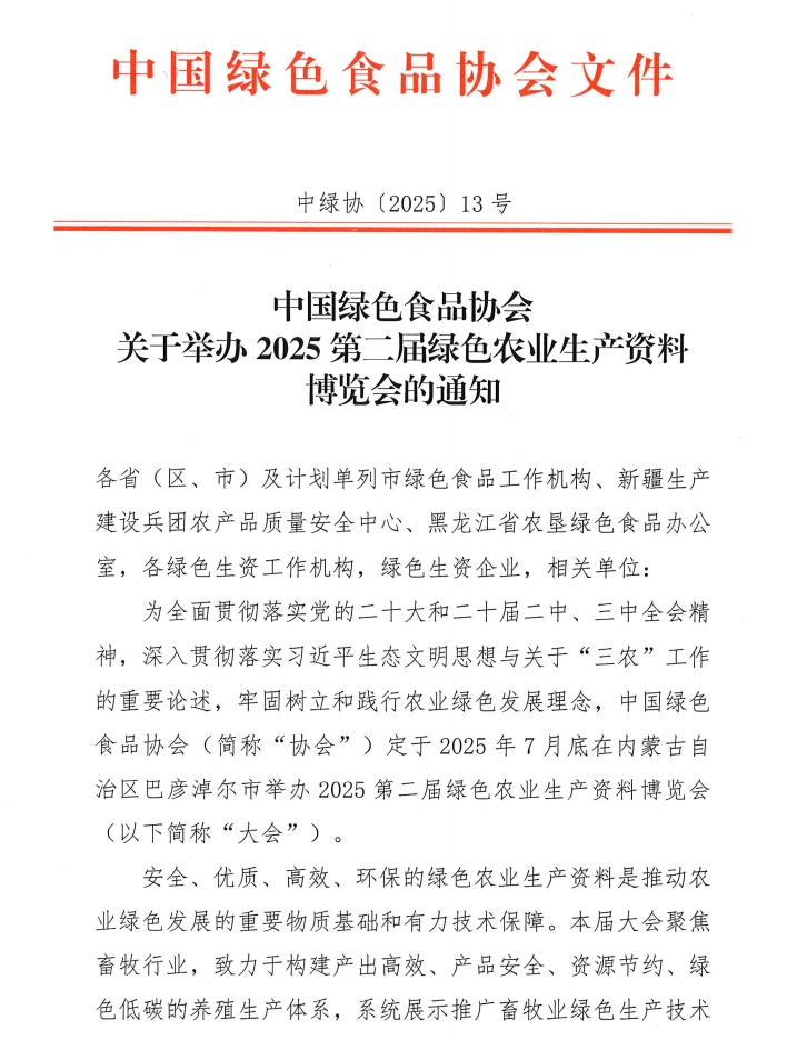中國(guó)綠色食品協(xié)會(huì)關(guān)于舉辦2025第二屆綠色農(nóng)業(yè)生產(chǎn)資料博覽會(huì)的通知